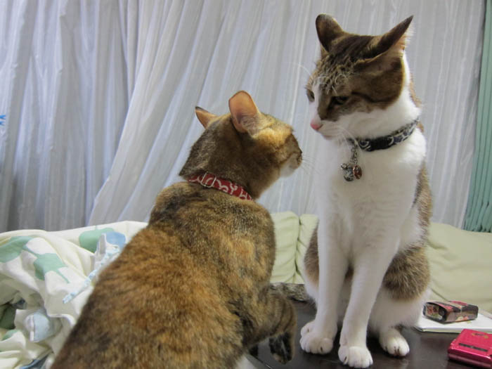 お互いに相手の額への猫パンチで牽制し合いながら、2匹のバトルが静かに始まりました。