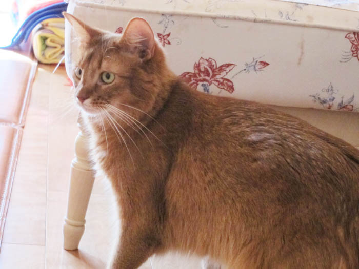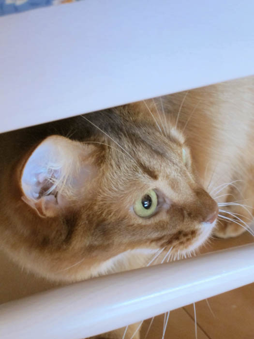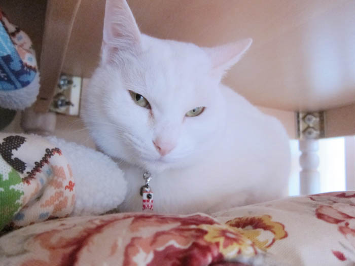 の膝をベッドに我が物顔でくつろぐぽっけ♂。大きい目にびっくり~。 オモチャで釣ってみることにしました。