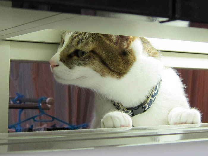 をかけるぽっけ♂。照明の入っている隙間に頭をひょいと入れて