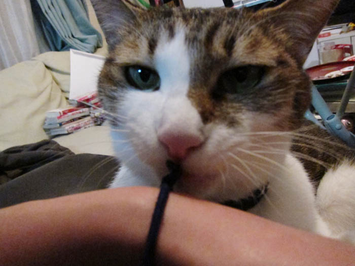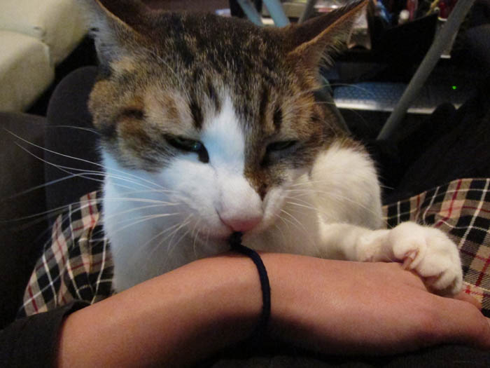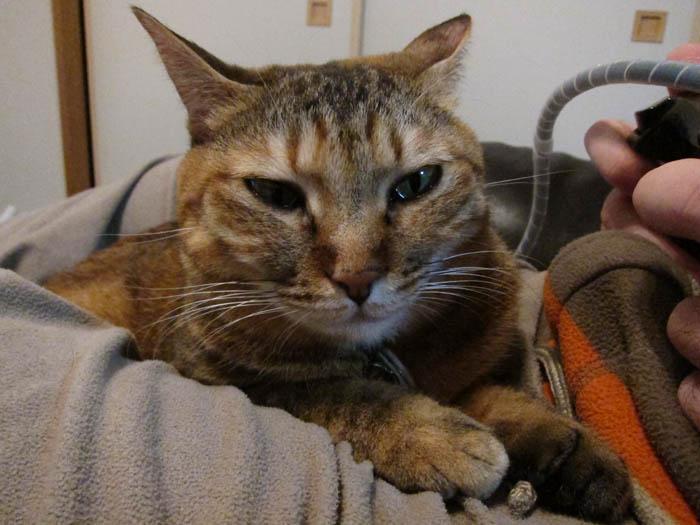 の膝の上で、ズボンの紐にじゃれつつも、眠気に負けそうな目です。