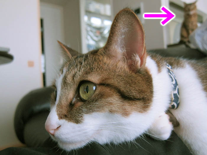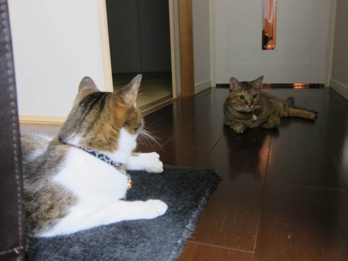 」と、ドア前で寝そべって毛づくろいをしているぴっち♀に対し、