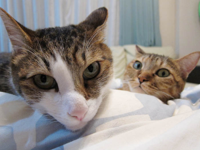 羽毛布団をベッドにお昼寝に励む2匹。