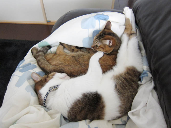 2008年 10/21(火) 66日目のぴっち♀とぽっけ♂ ~お昼寝ビフォーアフター~ 新規写真追加。ぽっけ♂アジの開きをもう1枚。2匹で背中合わせで寝た後には……。